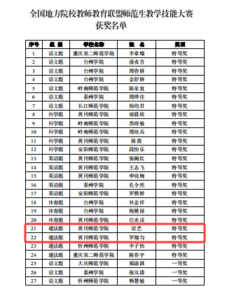 近日,全国地方院校教师教育联盟师范生教学技能大赛圆满落幕。我院学子表现卓越,思政2303班梁艺、思政2302班罗翔匀两位同学凭借扎实的专业功底与出色的教学展示,双双荣获大赛特等奖,指导老师分别是李霞副教授、陈叶玲副教授。